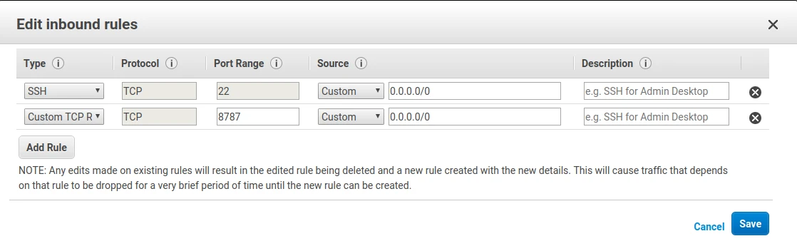 You’ll see that SSH is allowed through port 22 to an ip address range 0.0.0.0/0. This actually refers to every IP address. We’re going to add a new “Custom TCP” rule and allow all access to port 8787 from 0.0.0.0/0.