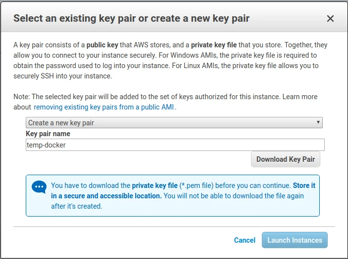 When you go to launch the instance, you’ll be asked about key pairs. Create a new key and be sure to download the pem file. I’m going to call the keypair “temp_docker”.