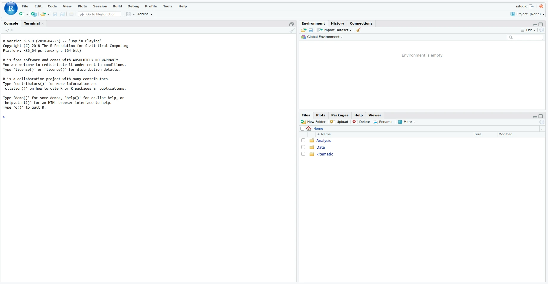 The default username and password are both rstudio. Logging in, I see a familiar interface.
